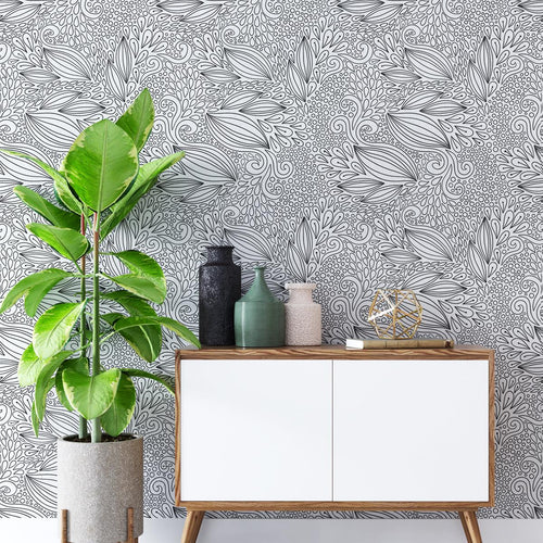 Leaves White Black Peel & Stick Wallpaper N012093