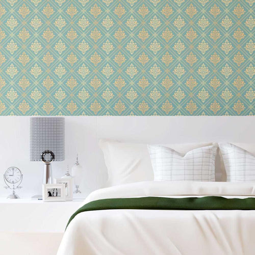 Damask Golden and Blue Peel & Stick Wallpaper N08108